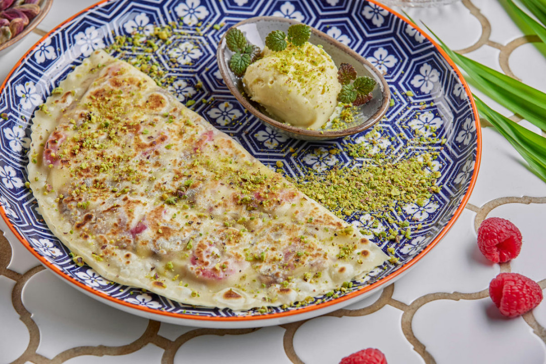 А на десерт шеф предлагает кутаб с шоколадной халвой, свежей малиной и заварным кремом, гарнируемый шариком ванильного мороженого и дробленой фисташкой (590 руб.) или марокканские блинчики багрир на манной крупе с кремом на основе сливок и финикового сиропа в сочетании с соусом англез (400 руб.).